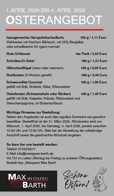 In der Metzgerei Max Barth erwartet Sie ein breites und schmackhaftes Angebot an verschiedenen Wurstwaren, sowie Fleisch in bester Qualität - unter anderem unser Dry Aged Steak, welches 7 bis 9 Wochen am Knochen reift und ein besonderer Genuss für Feinschmecker ist.